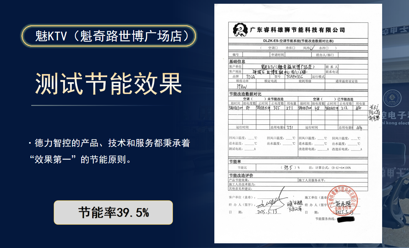 今年,德力智控成功為魅KTV(魁奇路世博廣場店)制冷(熱)系統進行節能改造,以39.5%的綜合節能率交出了一份亮眼的成績單,這個數字背后,是我們對KTV運營場景的深刻理解和空調節能技術的精準運用。