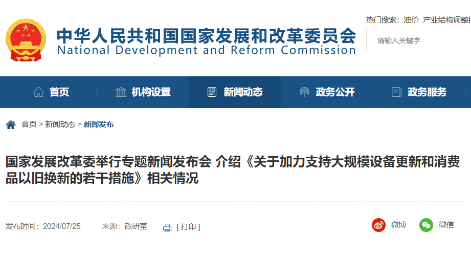 7月25日下午,國家發(fā)展改革委舉行專題新聞發(fā)布會(huì),就加力支持企業(yè)設(shè)備更新,消費(fèi)品以舊換新政策銜接、支持范圍、對(duì)消費(fèi)市場的影響,等方面問題回答記者提問。