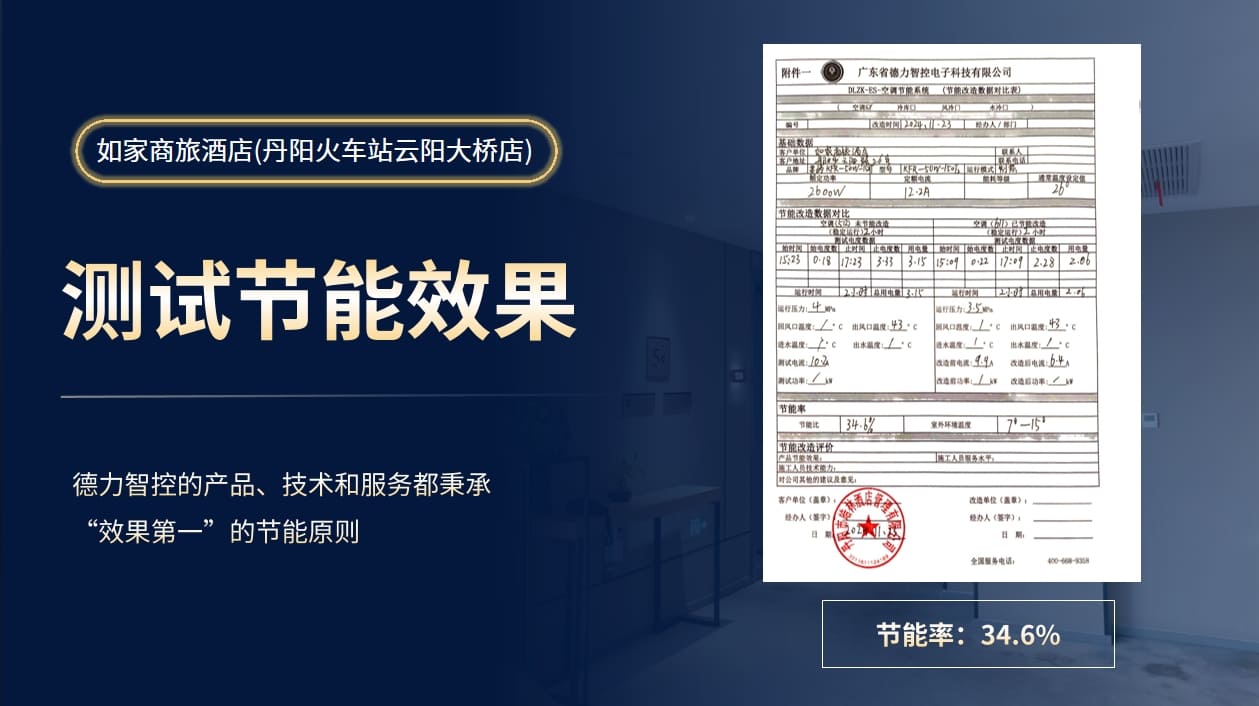 近日,德力智控為丹陽(yáng)市如家商旅酒店空調(diào)設(shè)備節(jié)能改造,實(shí)地打樣節(jié)能率34.6%!