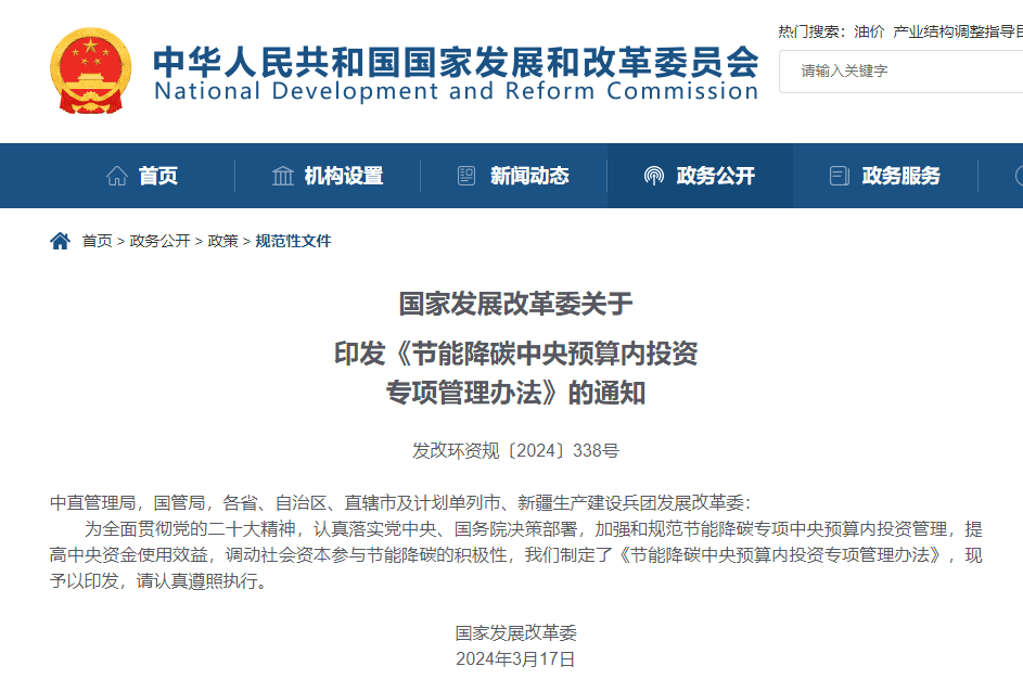 近日,國家發改委發布《節能降碳中央預算內投資專項管理辦法》。
