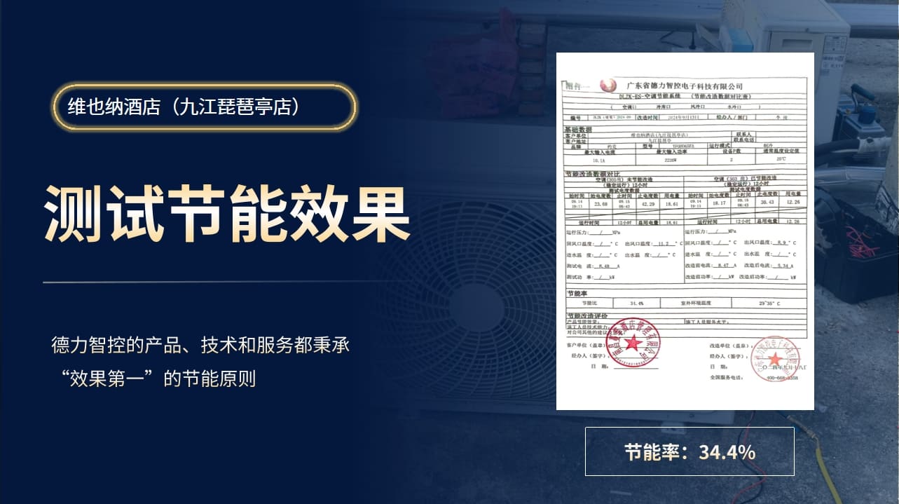 德力智控專業施工團隊挑選了酒店兩個客房的同品牌、同機型空調進行對比測試。在實地打樣過程中,將空調設置了相同出風溫度及風速,連續運行了12個小時,最終測算出節能效果,節能率34.4%!