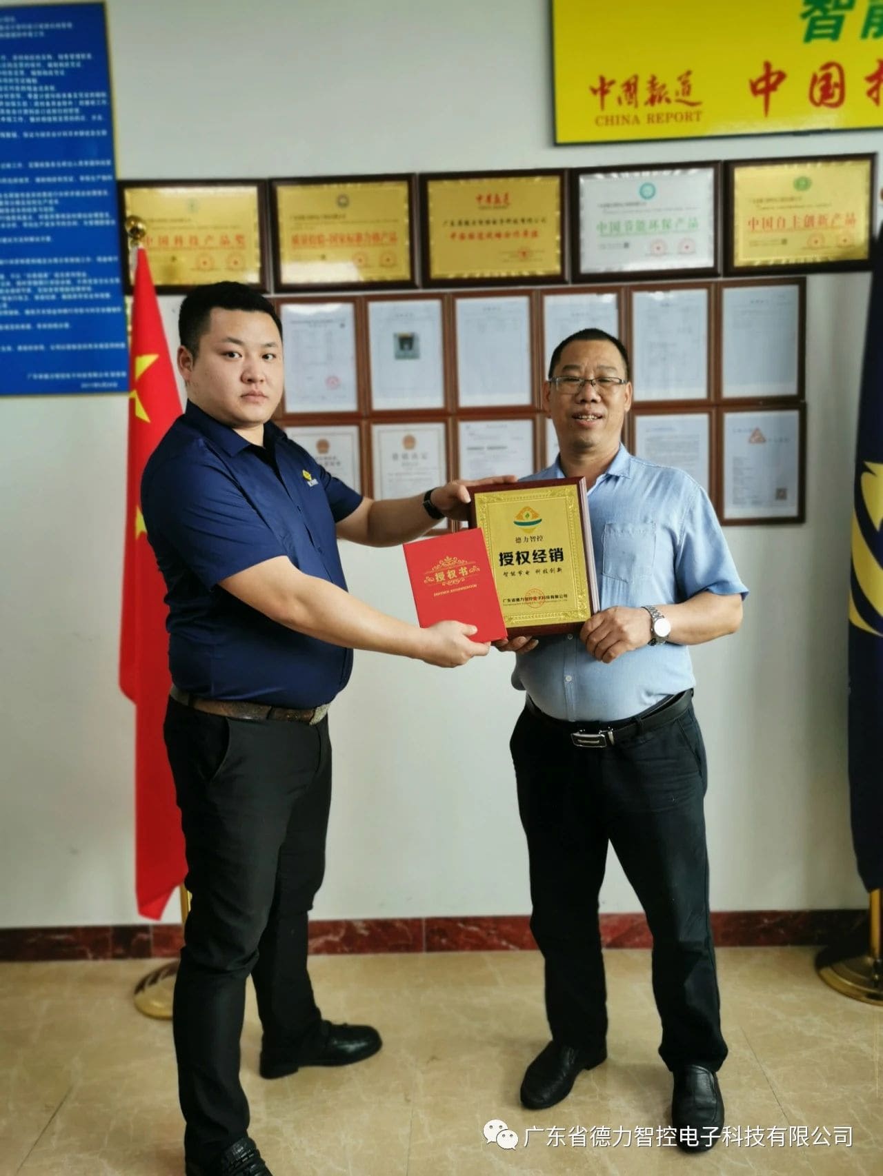 在簽約儀式上,我司德力智控總經理韓總與胡總進行了簡單而隆重的現(xiàn)場簽約,隨后由我司德力智控副總經理鐘總授予何總“特許經銷”牌。雙方在產品創(chuàng)新、營銷創(chuàng)新、品牌合作等方面達成戰(zhàn)略共識。同時,本次簽約儀式不僅是我司德力智控不斷尋求優(yōu)質合作伙伴、謀求共同發(fā)展的縮影,也是我司德力智控加大市場投入的著力點。