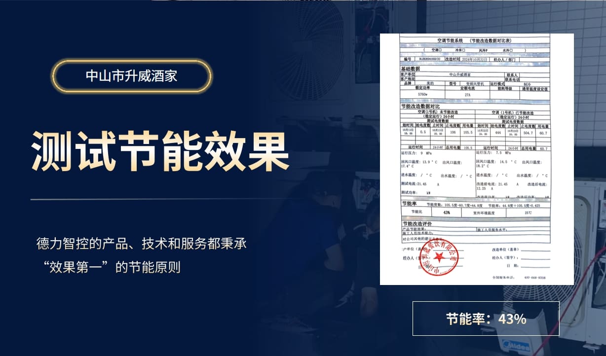 近期,升威酒家選擇了德力智控對酒樓內的空調節能改造,實地打樣節能率43%!