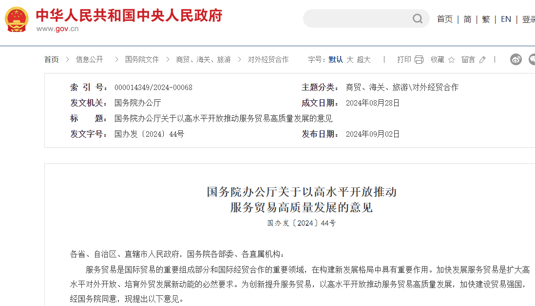 9月2日,國務院辦公廳發布了《關于以高水平開放推動服務貿易高質量發展的意見》。(以下簡稱:意見)
