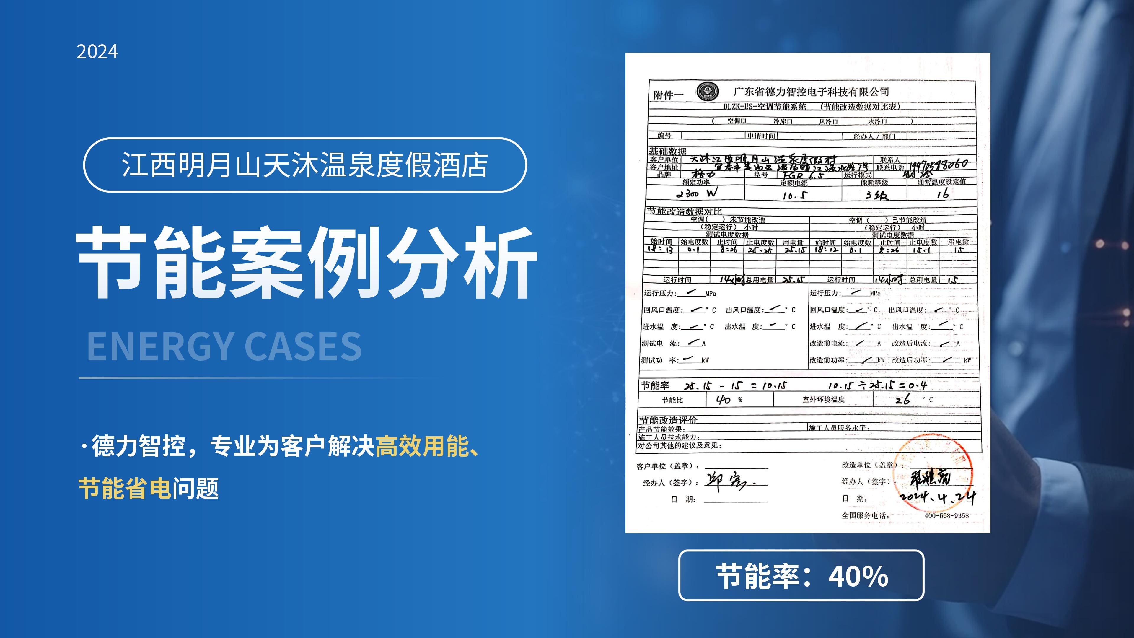 今年的四月份,德力智控為江西明月山的天沐溫泉度假酒店節能服務,節能率40%,這也恰好是其實際10%-40%節能效果的側面印證!