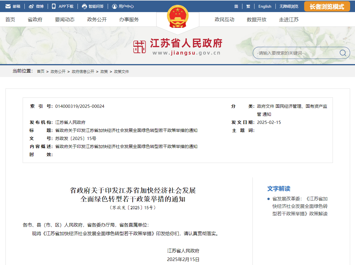 2月15日,江蘇省人民政府印發了加快經濟社會發展全面綠色轉型若干政策舉措的通知(以下簡稱:綠色轉型通知)。