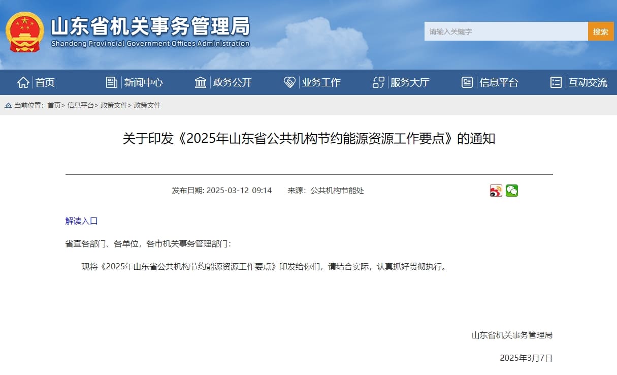 3月12日,山東省機關事務管理局印發了《2025年山東省公共機構節約能源資源工作要點》的通知(以下簡稱:能源工作要點)。